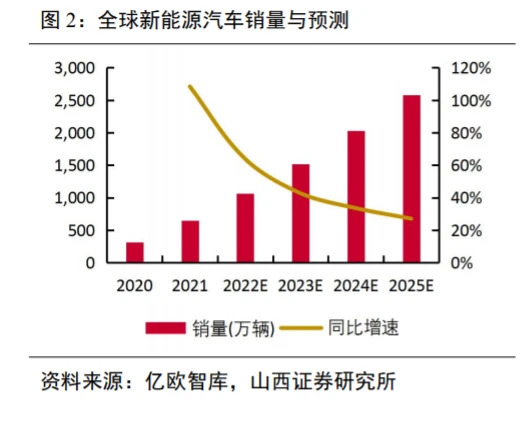 我国新能源汽车需求空间广阔,销量持续增加。随着国家政策的引导、购置税减免等各项补贴的落地,我国新能源汽车需求不断扩大。据中汽协数据,2022年1-11月我国新能源汽车产销分别完成625.3 万辆和606.7 万辆,同比均增长1倍,市场占有率达到25%。据乘联会数据,2022年11月新能源汽车国内零售渗透率达到36.2%,较2021年11月的20.8%提升了15.4个百分点。据亿欧智库数据,2021年中国新能源汽车销量为352万辆,同比增长157%,预计2025年中国新能源汽车销量为1359万辆;2021年全球新能源汽车销量为650万辆,同比增长108%,预计2025年全球新能源汽车销量为2580万辆。