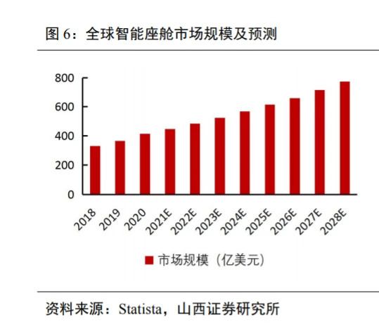 智能座舱实现难度较小,市场空间广阔。由于实现难度相对较小,成果易感知等,智能座舱将成为汽车智能化趋势下最先迎来快速发展的方向之一,市场空间广阔。据 Statista 预计,到2028年全球智能座舱市场规模将提升至775.4亿美元;据 ICVTank 预计,2025年中国智能座舱市场规模将达到1030亿元,2017-2025年均复合增长率达13%。