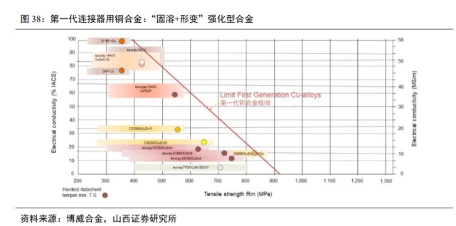连接器用铜合金主要经历了三代发展。第一代以普通黄铜、锡磷青铜锌白铜为主,主要以形变强化和固溶化为主;第二代以铁青铜、Cu-Ni-Sn-P 系为主虽然具备了析出相的析出强化,但占比不高,整体生产工艺还基本按照第一代铜合金工艺;第三代铜合金包括铬锆铜、铜镍硅系、钛青铜等,基本以析出强化为主,生产工艺也更为复杂,固溶、时效热处理要求更高。